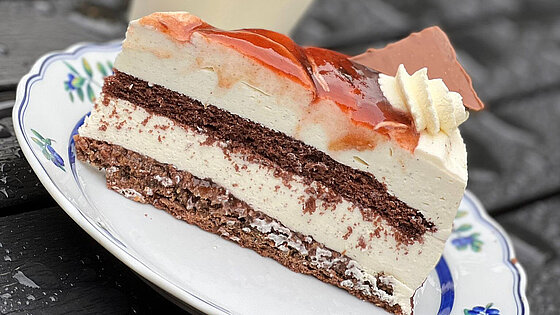 Im Oktober verzaubert uns unsere Hofkonditorei mit einer Pumpernickel-Quark-Sahne-Torte mit Pflaumenkompott und Zimt.