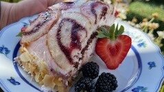 Die Torte des Monats Juli ist eine wunderschöne Kuppeltorte mit unseren hofeigenen Brombeeren, Buttermilch und Brombeerlikör.