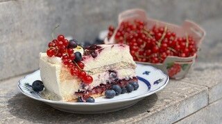 Im Juli servieren wir eine weiße Schokomousse mit Johannisbeer- Heidelbeerkompott und Johannisbeerweinbrand Tränke