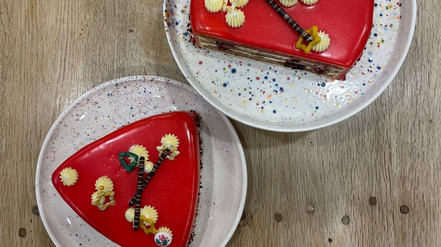Überzogen mit Marzipan und roter Schokoladen- Ganache.
