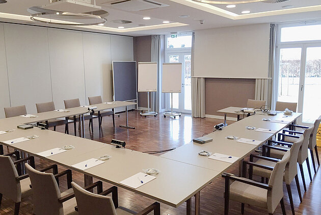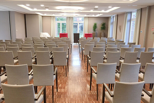 Unser Haus bietet Ihnen eine Vielzahl an Möglichkeiten auf einer Fläche von insgesamt 370 Quadratmetern. In Reihenbestuhlung finden hier bequem bis zu 200 Personen Platz, in parlamentarischer Bestuhlung reicht das Platzangebot noch für bis zu 100 Personen. Das große Platzangebot ist flexibel in vier kleinere Bereiche unterteilbar, die auch technisch separat voneinander zu steuern sind. Hier finden je nach Verwendung und Bestuhlungsform zwischen 10 und 40 Personen Platz.